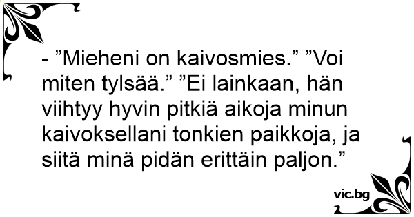 - ”Mieheni on kaivosmies.” ”Voi miten tylsää.” ”Ei lainkaan, hän viihtyy hyvin pitkiä aikoja minun kaivoksellani tonkien paikkoja, ja siitä minä pidän erittäin paljon.”