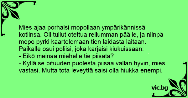 Mies ajaa porhalsi mopollaan ympärikännissä kotiinsa. Oli tullut otettua reilumman päälle, ja niinpä mopo pyrki kaartelemaan tien laidasta laitaan. Paikalle osui poliisi, joka karjaisi kiukuissaan: - Eikö meinaa miehelle tie piisata? - Kyllä se pituuden puolesta piisaa vallan hyvin, mies vastasi. Mutta tota leveyttä saisi olla hiukka enempi.