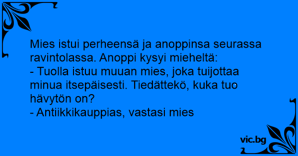 Mies istui perheensä ja anoppinsa seurassa ravintolassa. Anoppi kysyi mieheltä: