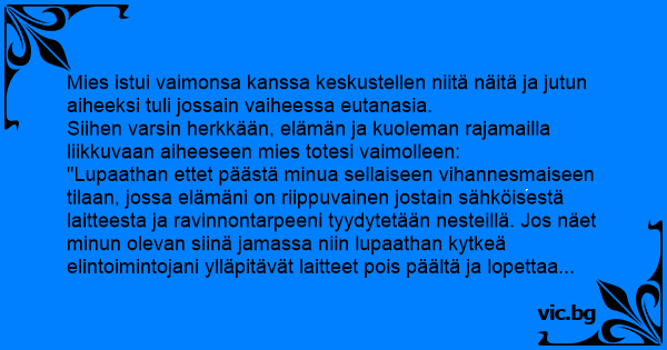 Kartą su žmona sėdėjom prie TV, kalbėjom apie gyvenimą... Ir kažkaip pasisuko kalba apie eutanaziją... Aš pažiūrėjau savo žmonai į akis ir Pasakiau: - Niekada neleisk mašinai palaikyti mano...