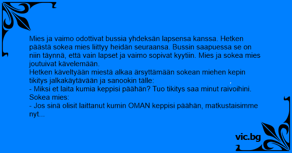 - Jos sinä olisit laittanut kumin OMAN keppisi päähän, matkustaisimme nyt bussilla ... että pidä sinä äijä vaan turpas kiinni