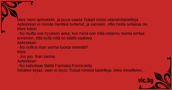 Mies meni apteekkiin, ja pyysi saada Tiukpil nimisi vitamiinitabletteja. Apteekkari ei moista merkkiä tuntenut, ja sanoikin, ettei heillä sellaisia ole. Mies totesi: