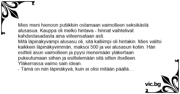 Mies meni hienoon putiikkiin ostamaan vaimolleen seksikästä alusasua. Kauppa oli melko hintava - hinnat vaihtelivat kahdestasadasta aina viiteensataan asti.