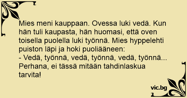 Mies meni kauppaan. Ovessa luki vedä. Kun hän tuli kaupasta, hän huomasi, että oven toisella puolella luki työnnä. Mies hyppelehti puiston läpi ja hoki puoliääneen: