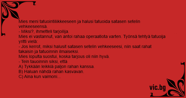- Jos kerrot, miksi halusit satasen setelin vehkeeseesi, niin saat rahat takaisin ja tatuoinnin ilmaiseksi.