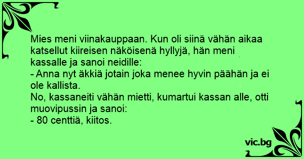 Mies meni viinakauppaan. Kun oli siinä vähän aikaa katsellut kiireisen näköisenä hyllyjä, hän meni kassalle ja sanoi neidille: