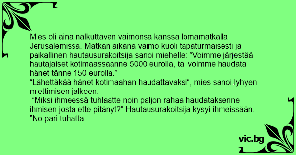 Mies oli aina nalkuttavan vaimonsa kanssa lomamatkalla Jerusalemissa. Matkan aikana vaimo kuoli tapaturmaisesti ja paikallinen hautausurakoitsija sanoi miehelle: ”Voimme järjestää hautajaiset kotimaassaanne 5000 eurolla, tai voimme haudata hänet tänne 150 eurolla.”