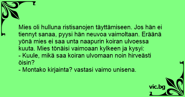 Mies oli hulluna ristisanojen täyttämiseen. Jos hän ei tiennyt sanaa, pyysi hän neuvoa vaimoltaan. Eräänä yönä mies ei saa unta naapurin koiran ulvoessa kuuta. Mies tönäisi vaimoaan kylkeen ja kysyi: