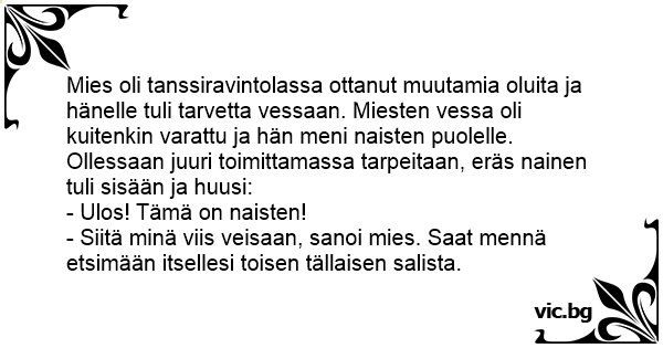 Mies oli tanssiravintolassa ottanut muutamia oluita ja hänelle tuli tarvetta vessaan. Miesten vessa oli kuitenkin varattu ja hän meni naisten puolelle. Ollessaan juuri toimittamassa tarpeitaan, eräs nainen tuli sisään ja huusi: