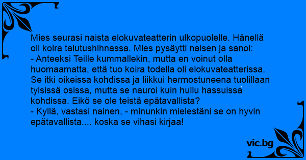 - Anteeksi Teille kummallekin, mutta en voinut olla huomaamatta, että tuo koira todella oli elokuvateatterissa. Se itki oikeissa kohdissa ja liikkui hermostuneena tuolillaan tylsissä osissa, mutta se nauroi kuin hullu hassuissa kohdissa. Eikö se ole teistä epätavallista?