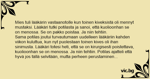 Mies tuli lääkärin vastaanotolle kun toinen kiveksistä oli mennyt mustaksi. Lääkäri tutki potilasta ja sanoi, että kuolioonhan se on menossa. Se on pakko poistaa. Ja niin tehtiin.
