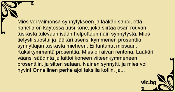 Sutuoktinių pora atvažiavo į ligoninę gimdymui. Gydytojas ir sako: - Aš sukūriau tokį aparatą, kuris dalį sarėmių skausmų perduoda kūdikio tėvui. Gal norėtumėte išbandyti? Abudu sutuoktiniai buvo...