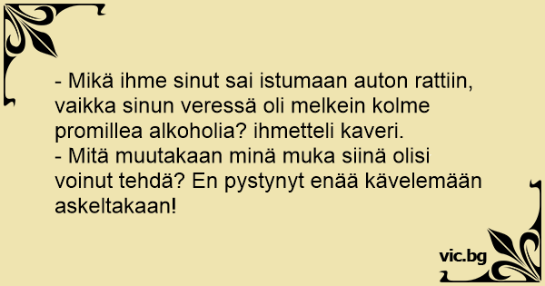 - Mikä ihme sinut sai istumaan auton rattiin, vaikka sinun veressä oli melkein kolme promillea alkoholia? ihmetteli kaveri.