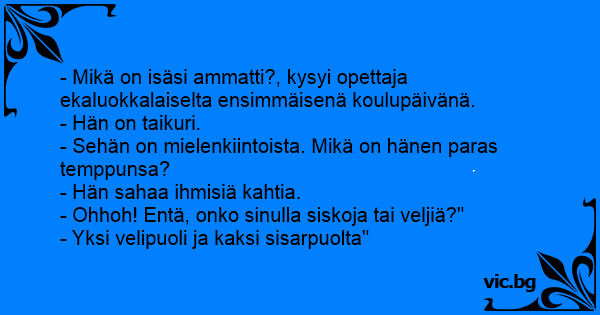- Mikä on isäsi ammatti?, kysyi opettaja ekaluokkalaiselta ensimmäisenä koulupäivänä.