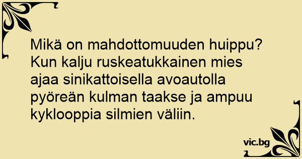 Mikä on mahdottomuuden huippu? Kun kalju ruskeatukkainen mies ajaa sinikattoisella avoautolla pyöreän kulman taakse ja ampuu kyklooppia silmien väliin.
