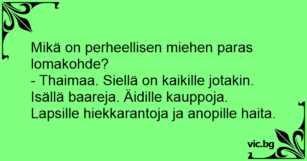 - Thaimaa. Siellä on kaikille jotakin. Isällä baareja. Äidille kauppoja. Lapsille hiekkarantoja ja anopille haita.
