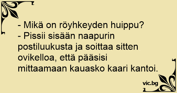 - Pissii sisään naapurin postiluukusta ja soittaa sitten ovikelloa, että pääsisi mittaamaan kauasko kaari kantoi.