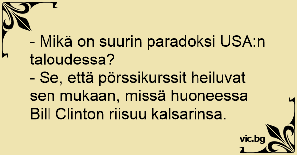 - Se, että pörssikurssit heiluvat sen mukaan, missä huoneessa Bill Clinton riisuu kalsarinsa.