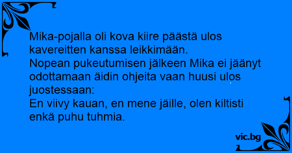 Nopean pukeutumisen jälkeen Mika ei jäänyt odottamaan äidin ohjeita vaan huusi ulos juostessaan: