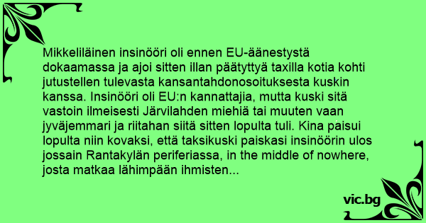 Mikkeliläinen insinööri oli ennen EU-äänestystä dokaamassa ja ajoi sitten illan päätyttyä taxilla kotia kohti jutustellen tulevasta kansantahdonosoituksesta kuskin kanssa. Insinööri oli EU:n kannattajia, mutta kuski sitä vastoin ilmeisesti Järvilahden miehiä tai muuten vaan jyväjemmari ja riitahan siitä sitten lopulta tuli. Kina paisui lopulta niin kovaksi, että taksikuski paiskasi insinöörin ulos jossain Rantakylän periferiassa, in the middle of nowhere, josta matkaa lähimpään ihmisten asuttamaan paikkaan oli useita kilometrejä. Insinööriä tietenkin vitutti yli kaiken tallustella pikkupakkasessa, pimeässä ja todennäköisesti ilman torttua yksin kotiin.