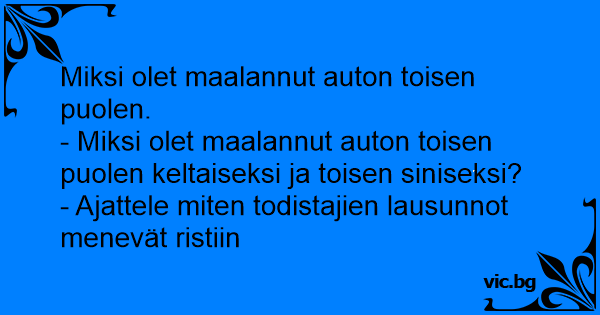 - Miksi olet maalannut auton toisen puolen keltaiseksi ja toisen siniseksi?