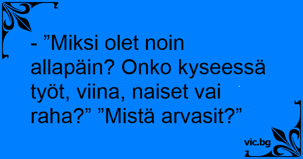 - ”Miksi olet noin allapäin? Onko kyseessä työt, viina, naiset vai raha?” ”Mistä arvasit?”
