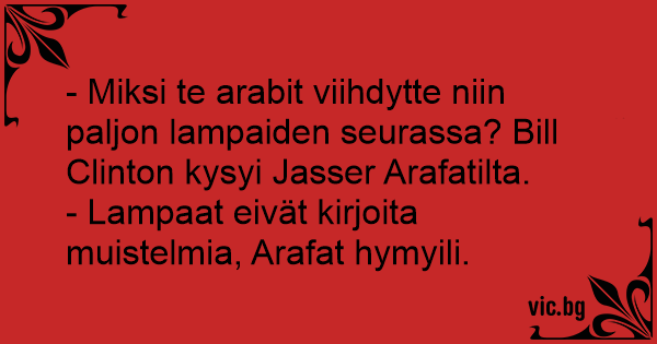 - Miksi te arabit viihdytte niin paljon lampaiden seurassa? Bill Clinton kysyi Jasser Arafatilta.