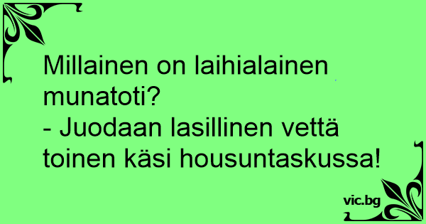 Millainen on laihialainen munatoti?- Juodaan lasillinen vettä toinen käsi housuntaskussa! 0 0 0 Laihialaisvitsit Lyhyet vitsit
