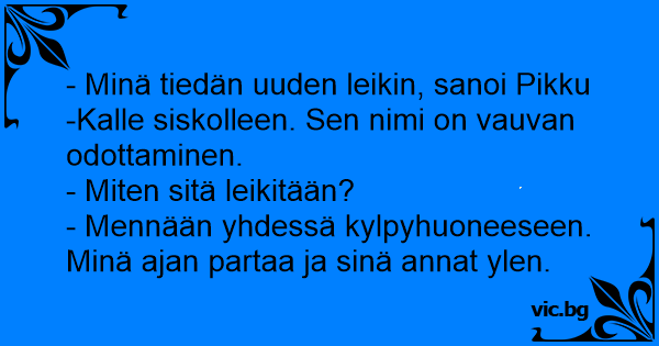 - Minä tiedän uuden leikin, sanoi Pikku-Kalle siskolleen. Sen nimi on vauvan odottaminen.