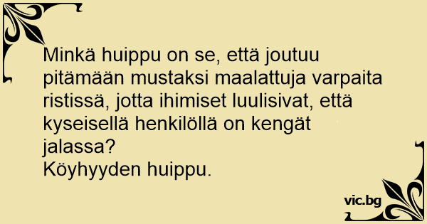 Minkä huippu on se, että joutuu pitämään mustaksi maalattuja varpaita ristissä, jotta ihimiset luulisivat, että kyseisellä henkilöllä on kengät jalassa?
