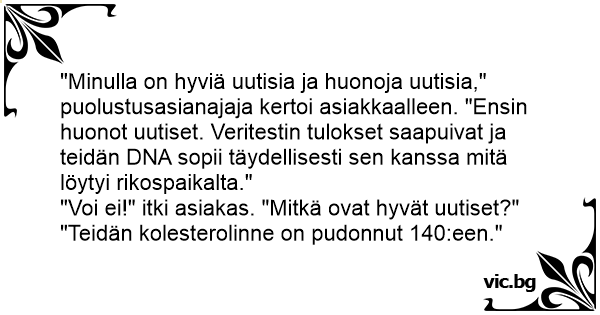 "I have good news and bad news," a defense attorney told his client. "First the bad news: The blood test came back, and your DNA is an exact match with the sample found on the victim's dress." "Oh, no - I'm ruined!" cried the client. "What's the good news?" "Your cholesterol is down to 140!"
