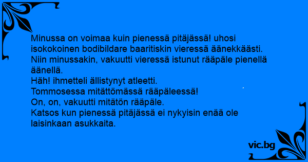 Minussa on voimaa kuin pienessä pitäjässä! uhosi isokokoinen bodibildare baaritiskin vieressä äänekkäästi.