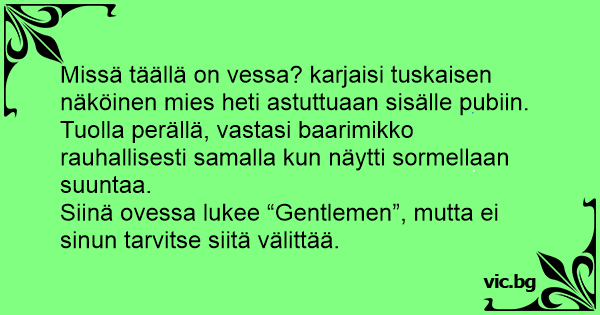 Missä täällä on vessa? karjaisi tuskaisen näköinen mies heti astuttuaan sisälle pubiin.