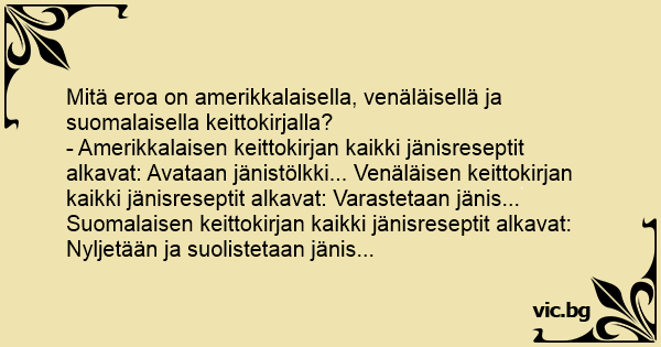 - Amerikkalaisen keittokirjan kaikki jänisreseptit alkavat: Avataan jänistölkki... Venäläisen keittokirjan kaikki jänisreseptit alkavat: Varastetaan jänis... Suomalaisen keittokirjan kaikki jänisreseptit alkavat: Nyljetään ja suolistetaan jänis...