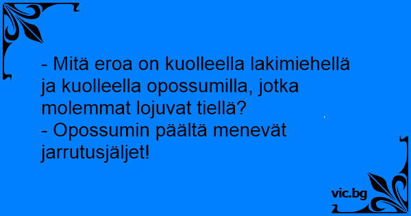 - Mitä eroa on kuolleella lakimiehellä ja kuolleella opossumilla, jotka molemmat lojuvat tiellä?