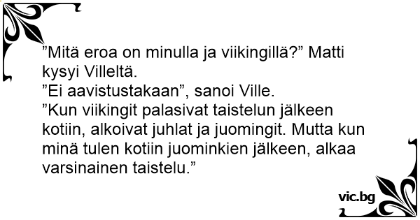 ”Kun viikingit palasivat taistelun jälkeen kotiin, alkoivat juhlat ja juomingit. Mutta kun minä tulen kotiin juominkien jälkeen, alkaa varsinainen taistelu.”