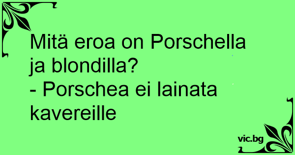 Unterschied zwischen einer Blondine und einer Zahnbürste Каква е разликата между една спортна кола и една блондинка? Каква е разликата между една блондинка и четка за зъби? Qual e' la differenza tra una bionda ed uno spazzolino da denti? Lo spazzolino da denti non si presta neanche al migliore amico. Mitä eroa on blondilla ja hammasharjalla? - Et anna ystäviesi lainata hammasharjaasi. What's the difference between a blonde and a toothbrush? You don't share a toothbrush with your friends. Hvad er forskellen mellem en blondine og en tandbø Hvad er forskellen mellem en blondine og en tandbørste? - Selv din bedste ven får ikke lov til at låne din tandbørste! Hvad er forskellen på en blondine... Hvad er forskellen på en blondine og en porsche? Porschen låner man ikke ud til vennerne. Jaka jest różnica między blondynką a Ferrari? - Ferrari nie pożyczyłbyś byle komu.