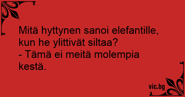 Mitä hyttynen sanoi elefantille, kun he ylittivät siltaa?<br />- Tämä ei meitä molempia kestä.