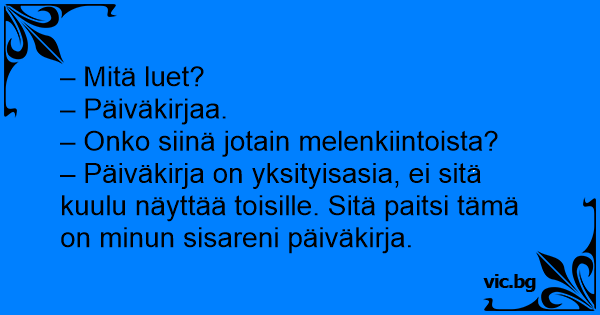 – Päiväkirja on yksityisasia, ei sitä kuulu näyttää toisille. Sitä paitsi tämä on minun sisareni päiväkirja.