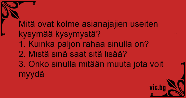 Mitä ovat kolme asianajajien useiten kysymää kysymystä?<br />1. Kuinka paljon rahaa sinulla on?<br />2. Mistä sinä saat sitä lisää?<br />3. Onko sinulla mitään muuta jota voit myydä