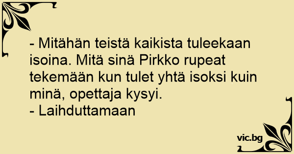 - Mitähän teistä kaikista tuleekaan isoina. Mitä sinä Pirkko rupeat tekemään kun tulet yhtä isoksi kuin minä, opettaja kysyi.