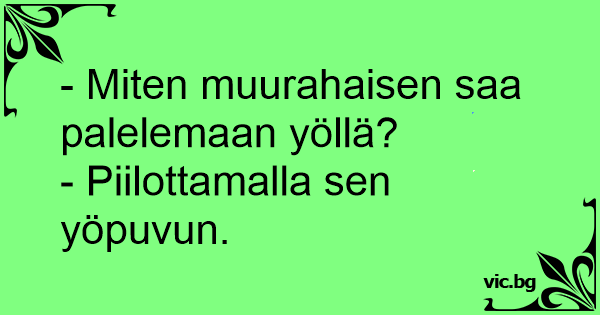 - Miten muurahaisen saa palelemaan yöllä?<br />- Piilottamalla sen yöpuvun.