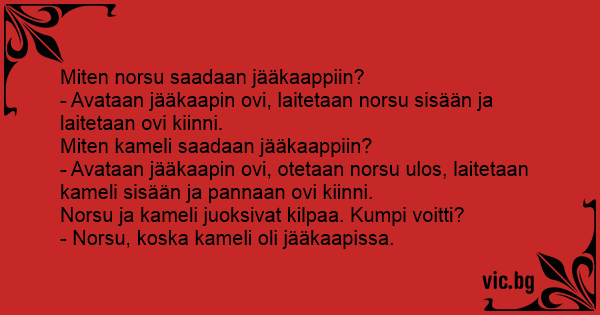 Студент е на изпит по логика. Професорът го извиква и пита: O Joãozinho pergunta para a professora: En un avion van 500 ladrillos y se cae 1, cuantos quedan? Comment met-on un éléphant dans un frigo en 3 mouvements ?, - On ouvre le frigo, - On met l'éléphant dans le frigo., - On referme la porte. Comment met-on un éléphant dans un frigo en 3 mouvements ? - On ouvre le frigo - On met l'éléphant dans le frigo. - On referme la porte.Comment met-on une girafe dans un frigo en 4 mouvements ? - On ouvre le frigo. - On enlève l'éléphant. - On met la girafe. - On referme la porte.Comment... One day on a plane there were 100 bricks and one fell off. How many are left? 99 What are the three steps to putting a giraffe in the fridge? 1. open the fridge 2. put the giraffe in 3.close the fridge What are the 4 steps to putting a rhino in the fridge? 1. open the fridge 2. take out the... Hvordan får man en elefant ind i et køleskab ? Man åbner køleskabet og sætter elefanten ind. Hvodan får man en giraf ind i et køleskab ? Man åbner køleskabet og tager elefanten ud og sætter... Como se coloca uma girafa dentro do frigorífico? 1. Abre-se a porta. 2. Tira-se o elefante. 3. Coloca-se a girafa. 4. Fecha-se a porta. Student: 503 bricks are on a plane. 1 falls off. How many are left? Teacher: 502. Student: How do you put an elephant in a fridge? Teacher:No you can’t fit an elephant in a fridge!! Student: Just... Time for a story: There are 500 bricks on a plane, one falls off. How many are left? What are the 3 steps to putting an elephant in a refrigerator? Open fridge, put in elephant, close fridge. What... Hvordan putter man en elefant i kjøleskapet? Svar: Man åpner døra, putter den inn og lukker igjen. Men vet du hvordan man putter en giraff inn i et kjøleskap? Svar: Du lukker opp døra, tar ut... Como se coloca um elefante no frigorifico? Abre-se a porta do VolksWagen, tira-se o elefante, fecha-se a porta, abre-se a porta do frigorífico, coloca-se o elefante dentro e fecha-se a porta. Йде іспит. Професор: — На борту літака 500 цеглин. Одна цеглина випала з літака. Скільки на борту залишилося цеглин? — Ну, це легко! 499! — Правильно. Наступне питання. Як покласти слона в... - Ile ruchów trzeba wykonać, żeby włożyć słonia do lodówki? - Trzy. Otworzyć lodówkę, włożyć słonia, zamknąć lodówkę. - A żeby włożyć żyrafę? - Cztery. Otworzyć lodówkę, wyjąć słonia, włożyć... Joãosinho pergunta para pedrinho: Pedrinho,como é que faz para colocar um elefante dentro da geladeira? Pedrinho:não sei como é que é? Joãsinho:abre a geladeira,coloca o elefante dentro e fecha a... Шефот: Имаш 50 цигли во авион, фрлаш една,колку ти остануваат? Кандидатот: 49 Шефот: Како во три потези ќе ставиш слон во фрижидер? Кандидатот: Отворам фрижидерот, го ставам слонот внатре, го... Lentokoneessa on 503 tiiltä. Yksi niistä tippuu lentokoneesta ulos. Montako tiiltä lentokoneessa on jäljellä? - 502 Okei. Miten voit laittaa Elefantin jääkaappiin? - Avaamalla sen ja sitten laittaa...