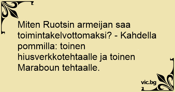 Miten Ruotsin armeijan saa toimintakelvottomaksi? - Kahdella pommilla: toinen hiusverkkotehtaalle ja toinen Maraboun tehtaalle.