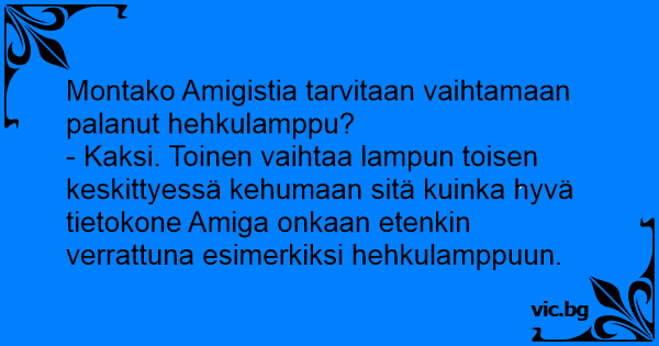 - Kaksi. Toinen vaihtaa lampun toisen keskittyessä kehumaan sitä kuinka hyvä tietokone Amiga onkaan etenkin verrattuna esimerkiksi hehkulamppuun.