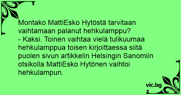 - Kaksi. Toinen vaihtaa vielä tulikuumaa hehkulamppua toisen kirjoittaessa siitä puolen sivun artikkelin Helsingin Sanomiin otsikolla MattiEsko Hytönen vaihtoi hehkulampun.