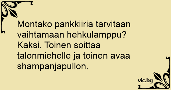 Montako pankkiiria tarvitaan vaihtamaan hehkulamppu? Kaksi. Toinen soittaa talonmiehelle ja toinen avaa shampanjapullon.