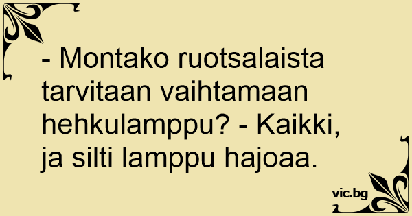 - Montako ruotsalaista tarvitaan vaihtamaan hehkulamppu? - Kaikki, ja silti lamppu hajoaa.
