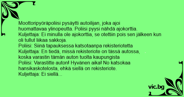 Poliisi: Varastitte auton! Hyvänen aika! No katsokaa hansikaskotelosta, ehkä siellä on rekisteriote.