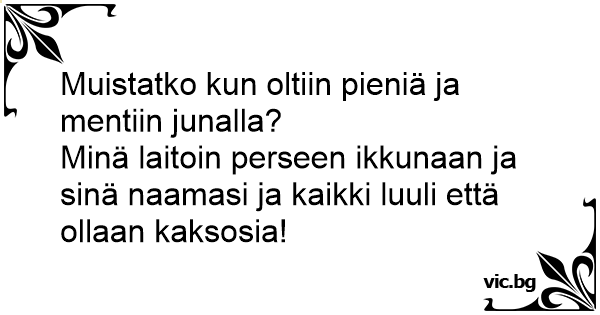 Minä laitoin perseen ikkunaan ja sinä naamasi ja kaikki luuli että ollaan kaksosia!